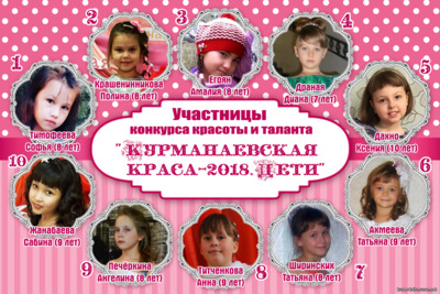 Завершён приём заявок на детский конкурс красоты и таланта "Курманаевская краса-2018". В нём примут участие 10 конкурсанток в возрасте 7-10 лет: 1.Софья Тимофеева, 2.Полина Крашенинникова, 3.Амалия Егоян, 4.Диана Драная, 5.Ксения Дахно, 6.Татьяна Ахмеева, 7.Татьяна Ширинских, 8.Анна Титченкова, 9.Ангелина Печёркина, 10.Сабина Жанабаева. Конкурс пройдёт 6 марта в 18-00ч. в преддверие Международного женского дня 8 марта. Девочек ждут три конкурса: визитная карточка, творческий конкурс и дефиле. Пожелаем всем участницам удачи в подготовке к конкурсу и выступлении! Следите за нашими новостями!
