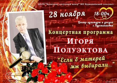 Уважаемые курманаевцы и гости нашего села! Приглашаем вас на концерт Игоря Полуэктова (г.Москва), посвящённый Дню матери. Когда: в эту среду, 28 ноября, в 18-00ч., Где: ЦКД с.Курманаевка. Вход свободный.