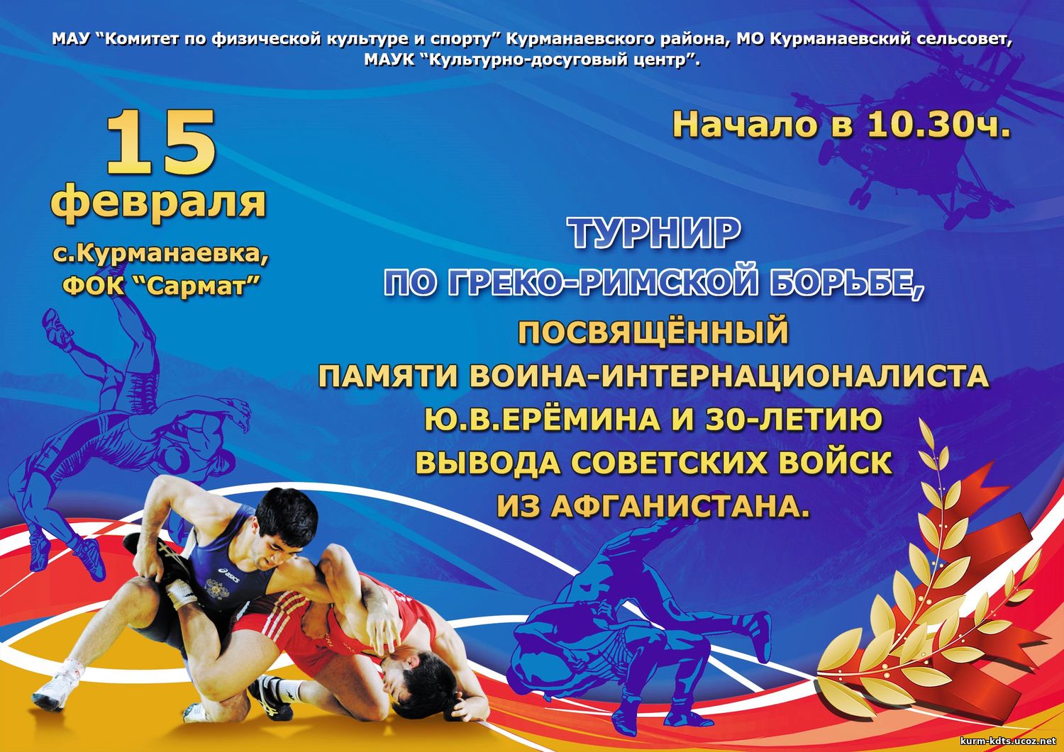 Уважаемые жители и гости с.Курманаевка! Спортсмены и любители спорта! В эту пятницу нас ждёт большое спортивное событие: в ФОК "Сармат" пройдут соревнования по греко-римской борьбе. В турнире примут участие команды из разных населённых пунктов нашей области, и, конечно, Курманаевского района! Мероприятие приурочено к 30-ой годовщине вывода советских войск из Афганистана и посвящено памяти нашего земляка, воина-интернационалиста, Юрия Васильевича Ерёмина. Торжественное открытие турнира в 10.30ч. Приходите болеть за наших спортсменов!