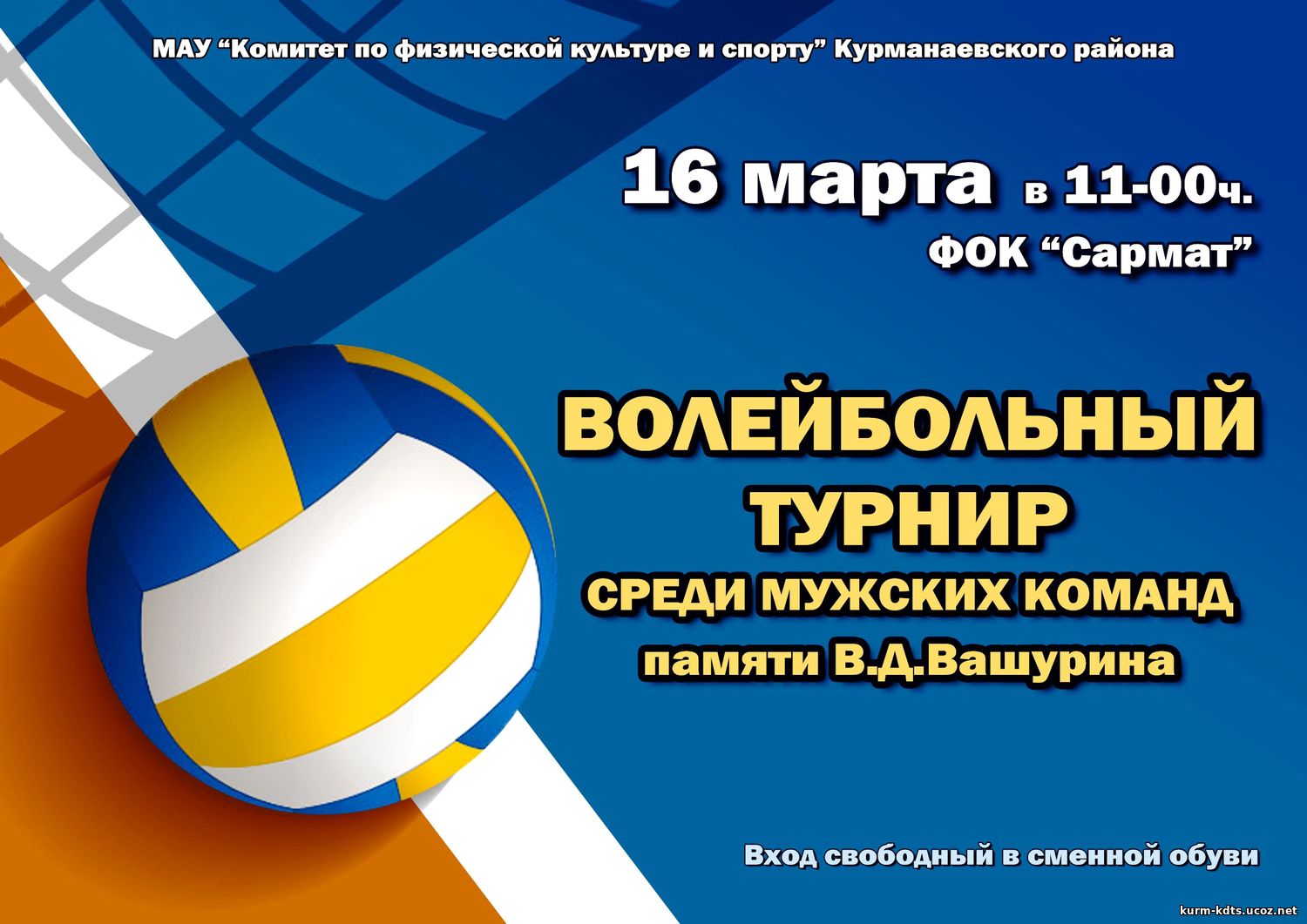 Уважаемые любители волейбола и все желающие! 16 марта 2019г. в ФОК "Сармат" состоится V-ый турнир по волейболу среди мужских команд, посвящённый памяти нашего земляка, Виктора Дмитриевича Вашурина. Начало в 11-00ч. Приглашаем зрителей и болельщиков поддержать игроков. | |