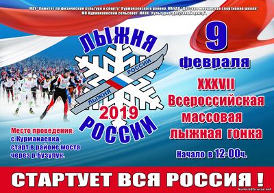 Приглашаем курманаевцев на «Лыжню России»! 9 февраля в с.Курманаевка пройдут соревнования в рамках 37-ой Всероссийской массовой лыжной гонки «Лыжня России-2019». Торжественное открытие начнётся в 12:00 ч. На соревнования приглашаются все желающие! | |
